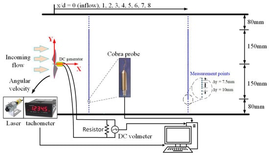 Figure 2 shows the measuring chain schematic. Measurements taken in the experiment include the instantaneous flow velocity components (streamwise, spanwise, and vertical), the blade angular velocity, the generator-produced electric current, and the total resistance of the circuit. The three velocity components were measured using a calibration-free, 4-hole Cobra probe manufactured by Turbulent Flow Instrument. The Cobra probe was positioned at the turbine hub level to collect the instantaneous wind speed data laterally from y = −230 to 230 mm (with intervals of 7.5 mm from y = −150 to 150 mm and intervals of 10 mm from y = −230 to −150 mm and from y = 150 to 230 mm) at the streamwise locations of x/d = 1, 2, 3, 4, 5, 6, 7, and 8 as well as at the inflow (at x/d = 0 without the model turbine placement), as shown in Figure 2. The measurements for each TSR condition have a total of 513 measurement points, and the measuring time was 120 s, with a sampling rate of 1200 Hz on each point. The actual measuring period for each case was approximately 24 h. The blade angular velocity was measured using an ACT-3X series panel tachometer equipped with the ROLS24-W remote optical laser sensor from Monarch Instrument. The electric current and the total resistance in the circuit were measured by a digital dc Voltmeter.