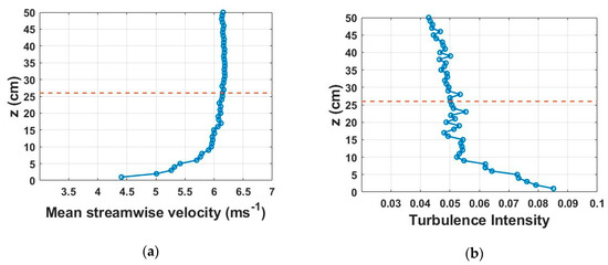 Vertical profiles of the incoming flow condition: (a) mean streamwise velocity; and (b) total turbulence intensity. The orange dashed lines represent the turbine hub level.