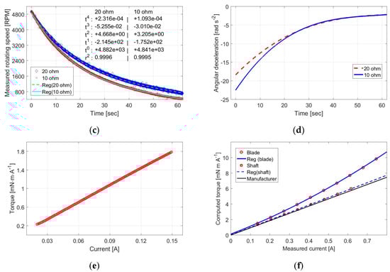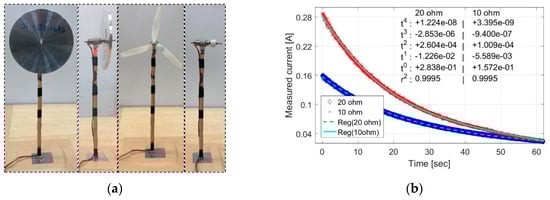 Estimates of the two friction-induced torque losses ( and ) require two separate testing experiments. The first testing experiment was to mount a circular aluminum disk on the generator shaft (see Figure 5a). The selected disk has a weight and a radius . The inertia of momentum for a circular disk can be calculated by . During the experiment, we used a direct current power supply (DCPS) to provide the current to the motor to raise the rotating speed of the disk to above 5000 RPM, and then switched to the generator state to record time series data of the electrical current and the rotation speed. Two resistors with 10 and 20 ohms were individually loaded to the generator. The time series data of the electrical current and the rotation speed for the two resistors are shown in Figure 5b,c. To get rid of spikes in the measured data, continuous electrical current and rotating speed distributions were constructed by a polynomial regression (the polynomial coefficients given in Figure 5b,c) and then used in the torque constant estimation. The angular deceleration of the disk was estimated from the differential of the rotating speed regression polynomial and shown in Figure 5d. In Equation (5), can be considered as a function of the disk weight and given in the following