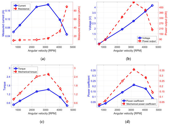 In Table 3, the TSR can be converted directly from the blade angular velocity (with a unit RPM) times a factor of 1.288 × 10−3 (computed from 2π/60·R/ = 2π/60·0.075/6.1). Hence, the angular velocities of 1000, 2000, 3000, and 4000 RPM correspond to the TSRs of approximately 1.3, 2.6, 3.9, and 5.2, respectively. Figure 6 has four subplots containing the relationships of the measured electrical current, the measured total resistance, the estimated generator voltage, the computed power output, the calculated torque, the estimated torque constant, and the power coefficient with respect to the blade angular velocity. As shown in Figure 6a, the measured current increases and then decreases with the increment of the blade angular velocity. The maximum current of 0.188 A occurs at the C4 condition (TSR = 4.1), whereas the relatively lower currents (less than 0.06 A) appear at both the low and high blade-rotating conditions (i.e., C1 and C6). Besides, the measured currents are found to increase with total resistance at the conditions of TSR ≤ 4.1 (with Rt ≤ 14.4 ohms). At the conditions of TSR = 5.2 and 5.9, the measured currents have an obvious decrease due to the overload with the total resistance of 31.2 and 88.8 ohms in the electrical circuit. This result indicates that the selected turbine generator is suitable for a load of approximately 15 ohms or less in the circuit to achieve the maximum allowable power output. The presence of the overload to the generator breaks down the quasi-steady approximation of electromagnetism to cause the emission of electromagnetic radiation, which leads to the magnet of the generator to lose energy.