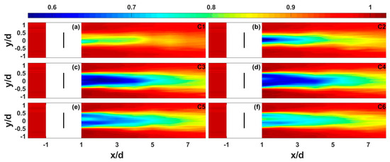 Contour plots of the time-averaged dimensionless vertical velocity under different TSRs of: (a) 0.9; (b) 1.5; (c) 3.0; (d) 4.1; (e) 5.2; and (f) 5.9, corresponding to C1–C6 conditions, respectively.