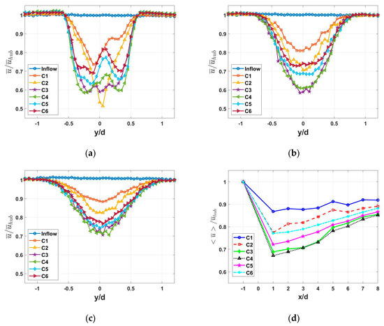 Lateral profiles of the time-averaged dimensionless streamwise velocity under the C1–C6 TSRs at the streamwise locations: x/d = 1 (a); x/d = 13 (b); and x/d = 15 (c); and the distribution of the laterally-averaged streamwise velocity (d). Here, the angle bracket represents a laterally spatial averaging from y/d = −0.5 to 0.5.