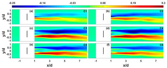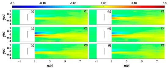 where the overbar denotes temporal average, is the lateral momentum flux, and and are instantaneous streamwise and spanwise velocity components, respectively. The magnitude of the momentum flux can be applied to explain the direction and extent of momentum transport in the turbine-induced wake area. As shown in Figure 13, the positive and negative momentum fluxes represent the upward and downward fluxes (on the figure), respectively, to facilitate the momentum transfer inward to the turbine wakes. As shown in Figure 7, the large wake velocity deficits appear on the turbine rotor operating at the C3 and C4 conditions, which are, of course, expected to require more momentum transported from adjacent flows to promote wake recovery. Hence, it can also be expected that increases in the magnitude of the lateral momentum flux in the wake region are relatively larger in the C3 and C4 conditions than the others. This behavior indicates that larger wake velocity deficits correspond to the stronger momentum fluxes.
