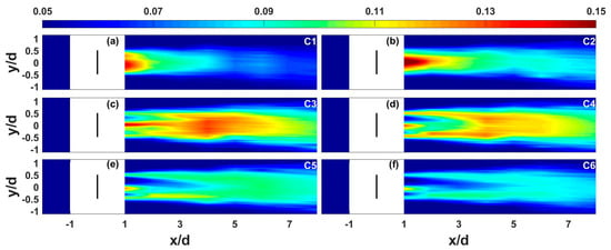 Figure 11 shows the total TI contours in the hub-level horizontal plane for the turbine operating at the six TSR conditions. To further compare the wake-enhanced TI at the different TSRs, Figure 12 shows the comparisons of the lateral profiles of the total TI at the streamwise locations of x/d = 1, 3, and 5, as well as of the streamwise distributions of the mean TI, which is averaged laterally from y/d = −0.5 to 0.5. In the figures, the turbine rotor produces different TI distributions under the considered TSR conditions. The local maximum wake-induced TI is found about 0.18 and appears at x/d = 1 in the C2 condition, which is accompanied by the occurrence of the maximum wake deficit (as shown in Figure 8a).