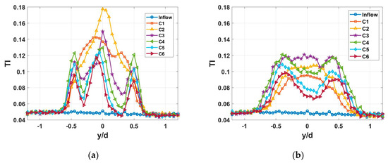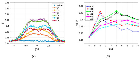 Lateral profiles of the TI under the C1–C6 TSRs at the streamwise locations: x/d = 1 (a); x/d = 3 (b); and x/d = 5 (c); and the streamwise distribution of the laterally-averaged TI (d). Here, the angle bracket represents a laterally spatial averaging from y/d = −0.5 to 0.5.