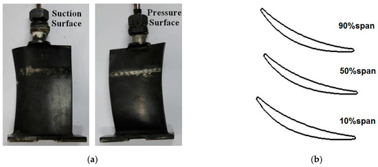 - Zhang, C.K.; Hu, J.; Wang, Z.Q.; Li, J. Experimental Investigations on 3D Blading Optimization for Low-Speed Model Testing. ASME J. Eng. Gas Turbines Power 2016, 138, 112602. [Google Scholar] [CrossRef]