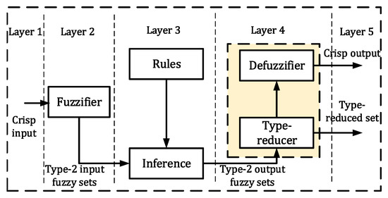 It has been demonstrated in [34] that the defuzzified output can be calculated as Equation (15) by simply taking an average of the and points. and , as the left and right end points of the type reduced set, are defined in Equation (14), where r and l are the switching points defined between that can be found via the Karnik and Mendel algorithm. are the firing level, and , are centers of the consequent output, and N is the number of rules.