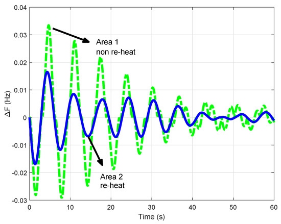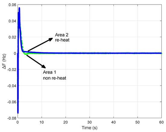 In this simulation, two disturbances of and are applied to areas 1, 2 of the system. Frequency deviations in areas 1,2 with the proposed controller are shown in Figure 7. As shown, the magnitudes of the frequency deviation in the areas 1, 2 are 0.04 and 0.05, respectively, which dies out very quickly and without any oscillations, while the frequency deviations with the PI controller are highly fluctuating as shown in Figure 8, which dies out only after about 60 s.