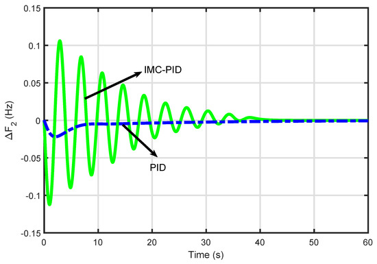 Frequency deviation in area 2 with the IMC-PID and PID controllers (case c-II).
