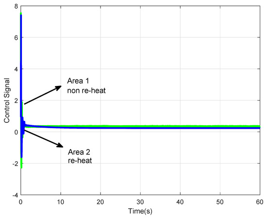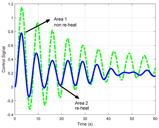 Then we use the Maclaurin series to tune the PID parameters by extending . The PID parameters of the IMC-PID controller are and . The PID controller coefficients are tuned with a trial-and-error method. The simulation results are shown in Figure 9 and Figure 10. It can be seen from the frequency deviation response in cases a, b, c-I and c-II that the IMC-PID and PID controllers have more oscillations compared to our proposed controller. It is evident that the proposed method has less fluctuation and better performance than other controllers. Moreover, the control signals in areas 1 and 2 with our proposed controller and PI controller are shown in Figure 11 and Figure 12, respectively, where both number and frequency of oscillations in PI controller are larger compared to our proposed method. The power exchanges between the two-areas are shown in Figure 13. It can be seen that power changes reach a steady value after a drop without oscillation. Therefore, the proposed method shows a suitable transient response in the two-area system and reaches a steady-state with no fluctuation.