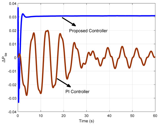 The simulation results by using the proposed and PI controllers are demonstrated in Figure 16 and Figure 17. As depicted in Figure 16 and Figure 17, the frequency deviations of areas 1 and 2 by proposed controller have very shorter settling time as well as overshoot than PI controller. The value of parameters of PI controllers are and , which are found using trial-and-error method.