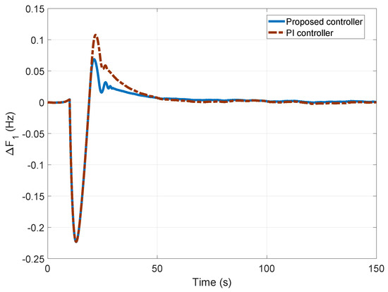 Frequency deviation in area 1 with proposed controller and PI controller.