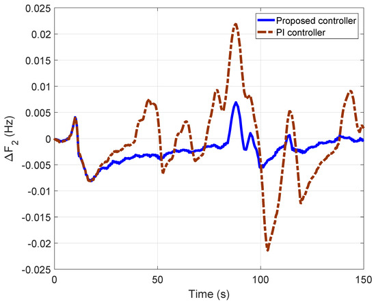 Frequency deviation in area 2 with proposed controller and PI controller.