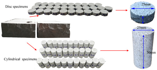 Granite was selected as the experimental material in our study. The samples were fine-grained granite with a grain size ranging from 0.5 to 1.5 mm (Chinese granite G655), which were collected from an outcrop located in Zhangzhou, Fujian, China (117.86° E, 24.83° N). No fissures were observed in the original rock. Two shapes of granite specimens were used: cylinders with the dimensions of 25 mm in diameter and 50 mm in length and discs with the dimensions of 25 mm in diameter and 10 mm in thickness (Figure 1). The mineralogy of the granite is described in Section 3.4.