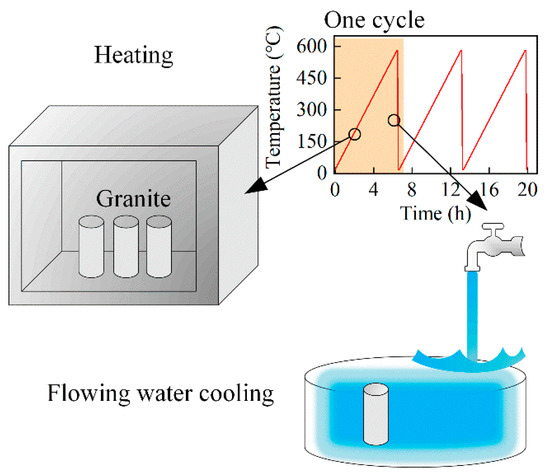 The granite cylinders were used for the measurement of porosity, permeability, P- and S-wave velocity measurements, whereas the granite disc samples were used for microstructural characterization. The P-wave and S-wave velocity of the cylindrical specimens were measured prior to thermal treatment. Thirty-one cylinders and thirty-one discs with similar P-wave velocities were divided into five groups with six specimens in each group (see Table 1). A SX-G04123 box-type electric furnace was used in heating (power 2.5 kW, maximum temperature 1200 °C). The process of heating a rock specimen to a pre-determined temperature and then cooling it down to room temperature with water was regarded as one thermal cycle. A heating rate of 1.5 °C/min was used to avoid the influence of thermal shock [39]. The pre-determined temperature, once reached, was kept constant for 5 minutes in the furnace to avoid the influence of subsequent heating time at a pre-determined temperature. The specimens were then taken out of the furnace and cooled down to room temperature (20 °C) with flowing water (shown in Figure 2). For each group, the pre-determined temperatures were set to 100–600 °C to mimic a high-temperature condition of deep bedrocks in an EGS system. The numbers of thermal cycles for each group was either 0 (i.e., no thermal treatment), 1, 2, 4, 8, and 16.