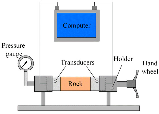 Before measuring the porosity and permeability, P and S-wave velocities of the rock specimens were measured after thermal treatment for different temperatures and numbers of thermal cycles were measured using an ultrasonic apparatus (HS-YS2A Type). Two transducers fixed by a holder applying the same force were positioned at the ends of the specimen. A pressure gauge and hand wheel were used to apply an equal force with transducers during every test (see Figure 3). Each specimen was tested twice to ensure repeatability.