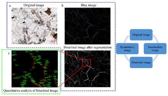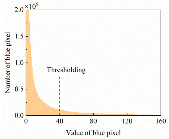 Microcracks appear blue under plane-polarized light because the blue epoxy filled the microcracks. We selected the color of blue epoxy (R: 70, G: 132, B: 171). Usually, it is not consistent in every CTS image. Then, we set the tolerance to 70 to ensure that the blue parts of the image were successfully selected. The results are shown in Figure 6b. Manual interactive thresholding segmentation was used for the segmentation process. The thresholding of 40 was applied to the intermediate image based on the image histogram (see Figure 7). The binarized image result is shown in Figure 6d, which was further used for quantitative analysis (Figure 6c).
