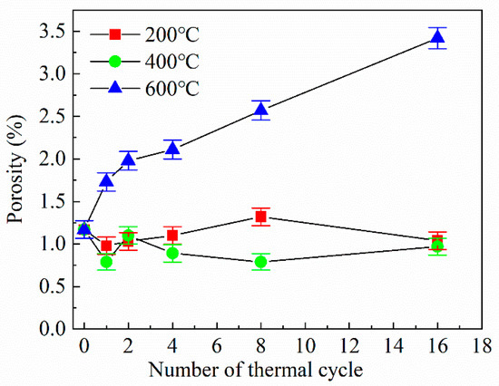 As shown in Figure 9, high temperatures (600 °C) had a greater effect on porosity than low heating temperatures (200 and 400 °C). Moreover, at 600 °C, porosity increased substantially as the cycle number increased from zero to two. At 200 and 400 °C, the influence of the number of thermal cycles on the porosity and permeability is negligible.