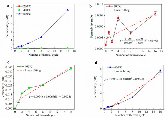 Permeability characteristics after thermal treatment. (a) Three different temperatures using same y axis. (b) The pre-determined temperature was 200 °C. (c) The pre-determined temperature was 400 °C. (d) The pre-determined temperature was 600 °C.