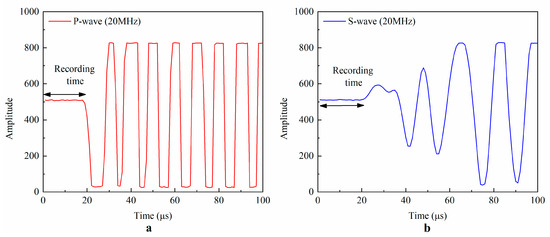 Typical P- and S wave forms recorded and used to determine velocities. (a) P-wave form. (b) S-wave form.