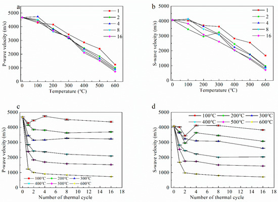 Variation of P-wave velocity and S-wave velocity changes with the number of thermal cycles and temperature. (a) Variation of P-wave velocity with temperature. (b) Variation of S-wave velocity with temperature. (c) Variation of P-wave velocity with the number of thermal cycles. (d) Variation of S-wave velocity with the numbers of thermal cycles.