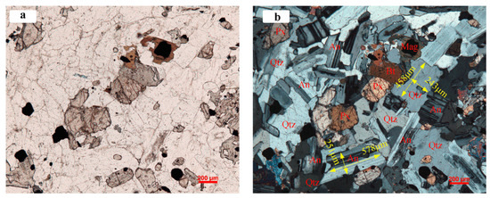 Polarized micrographs of granite without thermal treatment. (a) Plane polarized image; (b) cross polarized image. Qtz—Quartz; An—Anorthite; Bt—Biotite; Px—Pyroxene; Mag—Magnetite.