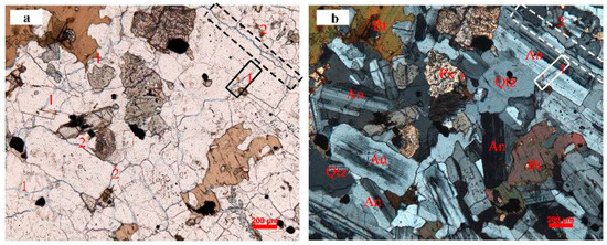 The types and location of granite fracture. (a) Plane polarized image; (b) cross polarized image. Qt—Quartz; An—Anorthose; Bt—Biotite; Px—Pyroxene. 1—grain boundary microcracks; 2—transgranular microcracks. (600 °C, 1 cycle).