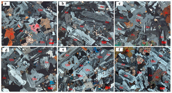 Cross polarized images of microcracks for granites subjected to different heating temperatures. (a) 100 °C; (b) 100 °C; (c) 200 °C; (d) 400 °C; (e) 500 °C; (f) 600 °C. Qtz—Quartz; An—Anorthose; Bt—Biotite; Px—Pyroxene.