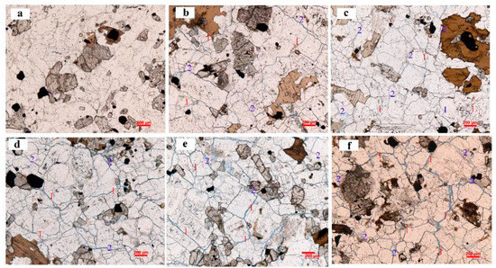 Plane polarized images of microcracks in granites subjected to different heating temperatures. (a) 100 °C; (b) 100 °C; (c) 200 °C; (d) 400 °C; (e) 500 °C; (f) 600 °C; 1—grain boundary microcracks; 2—transgranular microcracks.