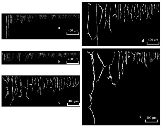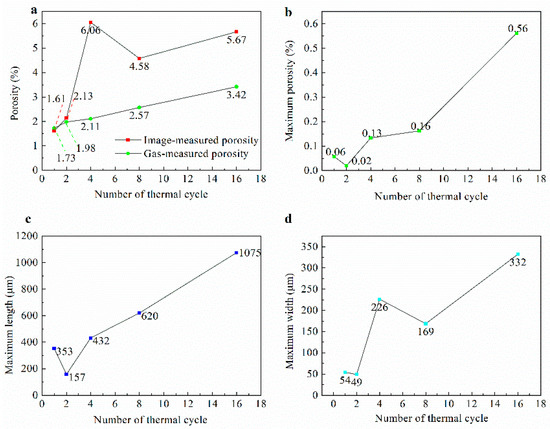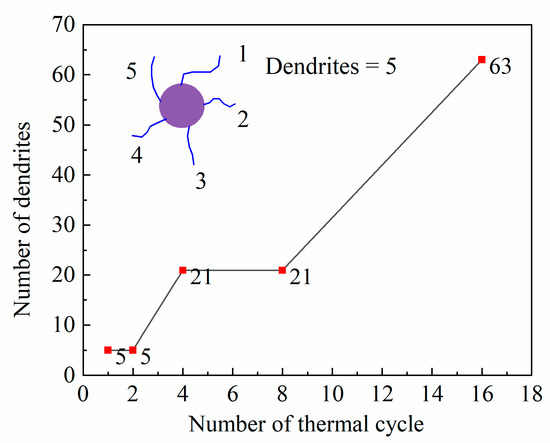 The results of the CTS image processing are presented in Figure 21. Generally, differences were observed between the porosity measured via gas permeability measurement and microscope observations. The latter increased by 3.5 times from one cycle to 16 cycles, which rose from 1.61% to 5.67%. Conversely, the former only increased from 1.73% to 3.42% (Figure 21a). Measurements of maximum porosity, maximum length, and maximum width tended to increase with a greater number of thermal cycles (see Figure 21b–d). The line charts revealed that the development of microcracks induced by thermal stress increased with the rise of thermal cycles. The number of measured dendrites is shown in Figure 22, which also increased with the number of thermal cycles, by almost 13 times to 63. This clearly illustrates the expansion of microcracks with the number of thermal cycles at high heating temperatures.