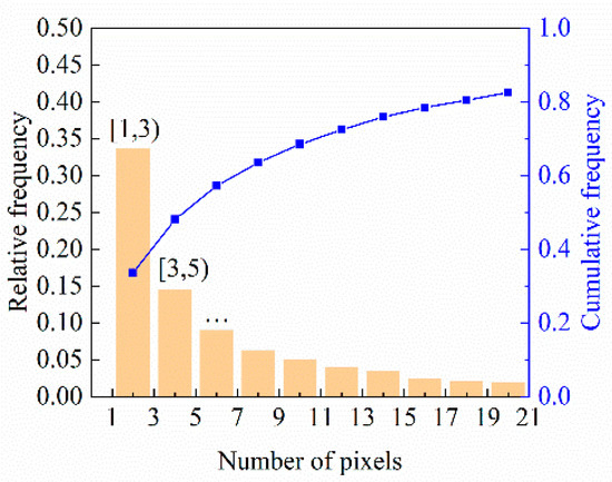 We conducted a statistical analysis of the microcracks area to explore the distribution of pores size. As shown in Figure 20, relative frequency of microcracks descended rapidly from 0.35 to 0.05. 80% of pores contained less than 21 pixels or 17.01 μm2 (1 pixel ≈ 0.81 μm2). Tiny pores were the most numerous among all microcrack sizes.