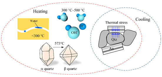 During the process of heating and cooling, a series of physical and chemical reactions have occurred in granite (see Figure 23). When the heating temperature exceeded 100 °C, water inclusions that originally existed in the granite pores due to wettability and capillary force-escaped rock in the form of gas [8]. As a result, the P-wave velocity decreased. The chemical formula for biotite is . In the temperature range of 300–500 °C, due to the escape of crystal water and dissociation of the H+ and OH− (the existing form of constitution water in the mineral crystal lattice structure), the mineral framework was destroyed and microcracks developed in rock [17,42]. When the heating temperature reaches 573 °C, low-temperature α quartz turns into high-temperature β quartz, which is accompanied by a sudden volume expansion [7,43,44,45]. This transition results in severe derogation of the granite. During the heating process, due to differences in the thermal expansion coefficients of different minerals, thermal stresses accumulate at granular interfaces, even if the temperature field outside is uniform. This expansion mismatch primarily contributes to the development of grain boundary microcracks [24,46]. During the cooling process, granite specimens are placed in the flowing water, which induces the sudden variation of temperature and results in the gradual formation of grain boundary microcracks and transgranular microcracks among rock minerals. Water then invades the connected microcracks, resulting in new chemical reactions in the minerals. Because the transition of quartz to β quartz is a reciprocal reaction, the granite specimens experience repeated damage with an increasing number of thermal cycles.