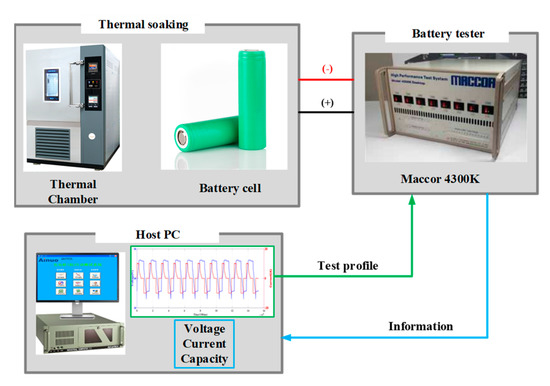 To validate the proposed method and accumulate the aging data, the experimental testbench shown in Figure 1 was used. The battery test-bench was set up to collect the experimental data and consisted of a battery charge/discharge regulator (Maccor 4300K), a thermal chamber, and a personal computer (PC). The battery regulator used a charging/discharging battery. The computer controlled the battery regulator and recorded the voltage and current data. The thermal chamber was used to maintain a constant temperature of 25 °C. The battery used in the experiment was a nickel manganese cobalt-oxide (NMC) battery with a rated discharge capacity of 3.3 Ah and a rated voltage of 3.56 V, as represented in Table 1.