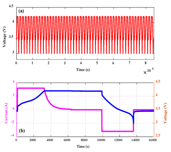 Profiles obtained in the cycling test: (a) entire voltage profile and (b) voltage and current profile at one cycle.