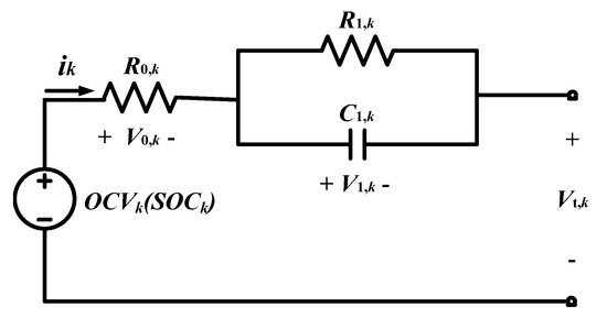 The ECM corresponding to the battery is essential for estimating the internal state. The ECM consists of the SOC, OCV, ohmic resistance (R0), diffusion resistance (R1), and diffusion capacitance (C1), as shown in Figure 3. The OCV is SOC and time-dependent and it is defined as a function of SOC. The SOC is the ratio of the remaining capacity of the battery to the nominal capacity (Cn). The SOC is calculated using the Ampere hour (Ah) counting method, as follows.