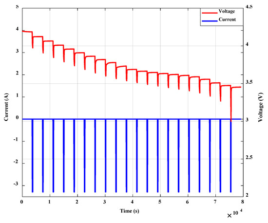 The purpose of the OCV test is to identify the electrical potential capability and parameters of the ECM, according to the SOC, as shown in Figure 4. The OCV test is conducted to acquire the OCV according to the SOC. The full charged battery (SOC 100%) is discharged with constant current (CC) and we settle the discharging amount to SOC 5%. The OCV points were extracted to a 5% interval in the SOC range of 0–100%. The applied current value of the pulse test is set to 1 C-rate, which refers to a multiple of the rated capacity. Figure 4 represents the method of parameter identification. The OCV is obtained when the region that current is not applied rests, as shown in Figure 5. The ohmic resistance (R0), diffusion resistance (R1), and capacitance (C1) are acquired when the current applies to the battery as follows: