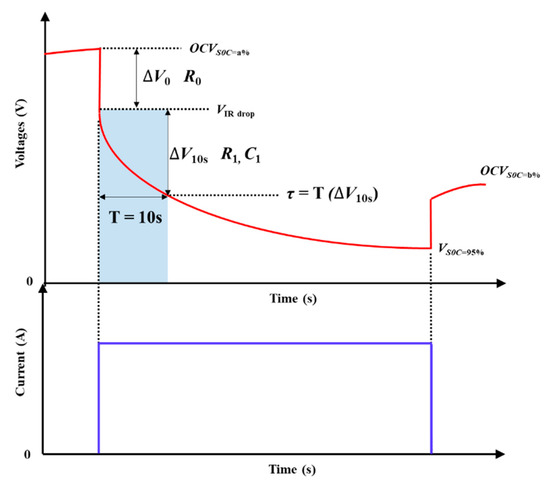 where ΔV0 is the voltage drop in OCV, ΔV10s is the voltage drop during the discharge at 10 s, and τ is the time constant as shown in Figure 5.