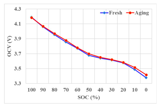 Figure 6 is the comparison of the SOC-OCV curve, which is extracted from Figure 4. The fresh value is the initial condition and aged when the battery is charged and discharged at 700 cycles. The tendency of OCV-SOC is very similar and the average difference is about 0.014 V. OCV has little change in the SOC 100% region, but OCV in SOC = 0%, which can be selected as a candidate for HI because the difference is largest in the entire SOC region. Therefore, since the OCV is highly dependent on the SOC than the number of cycles, it is not suitable to define the OCV for HI.