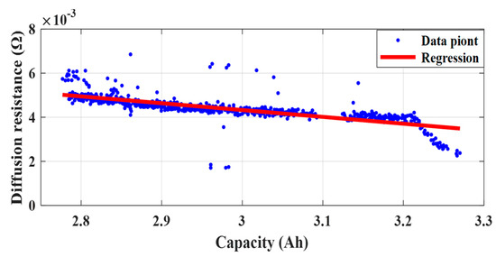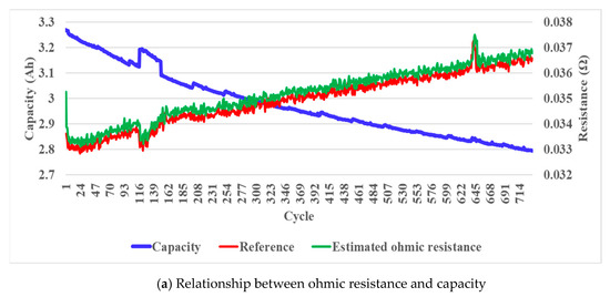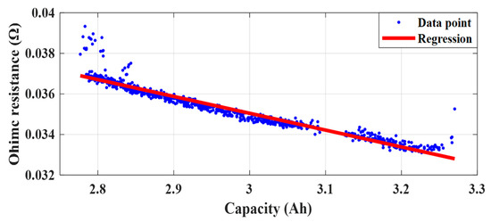 Due to this limitation, the method for estimating the SOH in real-time applications needs to define the relationship between the internal resistance based on the direct-current signal and the capacity. Pan et al. [28] proposed an online SOH estimation method using machine learning and the ECM parameters, such as the enlarged ohmic and polarized internal resistances. Because these parameters are intuitive values and are flexible for different types of dynamic load profiles, they can be measured by an online parameter identification algorithm. However, the machine learning method is difficult to apply to online applications because of complex computation.