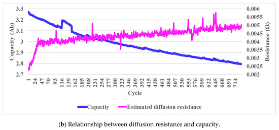Using the Multiple Adaptive Forgetting Factor-Recursive Least Square (MAFF-RLS) method, R0 and R1 were identified according to time-series data. These parameters were utilized as HIs to supplement the nonlinear relationship of variables in the prediction model. As the cycle progressed, the battery capacity increased, along with the ohmic resistance and diffusion resistance, as shown in Figure 7. In the entire cycle, when the capacity decreases, both ohmic (R0) and diffusion resistance (R1) increase, according to the cycles, as shown in Figure 7a,b. Therefore, those results show that the capacity and the two resistances have a relationship for each other.