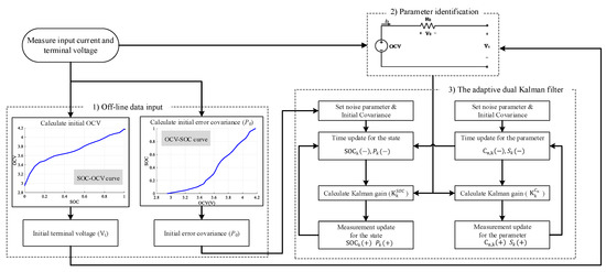 The Dual Extended Kalman Filter (DEKF) is a recursive algorithm for accurately estimating the two-state of the system by merging the previous state and the measurement value. Using a single extended Kalman filter (EKF) has the advantages of a relatively simple mechanism and a small computational burden. Although EKF is widely accepted, there are several limitations to this approach. Nikolaos et al. [34] analyze the performance of EKF and DEKF, according to the different SOH degrees. Although the DKEF shows weaker performance than the EKF in the fresh condition, the DEKF enhances the convergence ability of the observer when the SOH is decreasing. As a result, the DEKF has relatively better performance than EKF in the long term. Thus, to merge with the prediction model and state estimator, a single EKF is not suitable for maintaining the stability and accuracy of the observer in the circumstance of battery aging [34,35]. To simultaneously identify the SOC and capacity of a battery and improve the stability of an observer, in the DEKF, the ECM has two EKFs. The two EKF observers run in parallel to estimate the SOC and capacity.