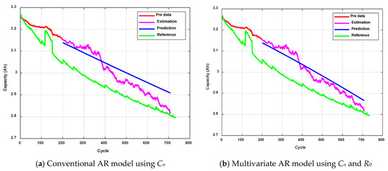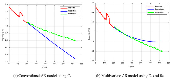 For the previously mentioned AR model, the estimation and capacity prediction results were dependent on the accuracy of the measured data and the selection of the HI. In this study, the capacity was predicted using the multivariate AR model and the HI. The capacity for the next 500 cycles was predicted according to the capacity in the previous 200 cycles. The multivariate AR model combining R0 and Rdiff prediction data, which was expected to have strong correlation with capacity, was used for the AR model. The equation for predicting the capacity was as follows.