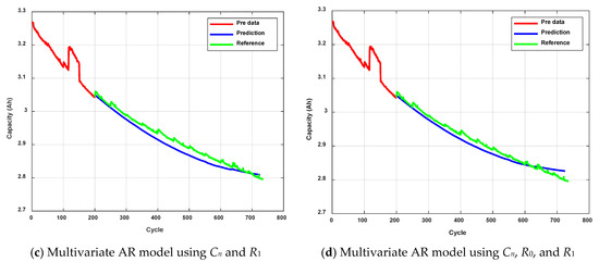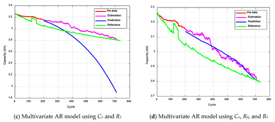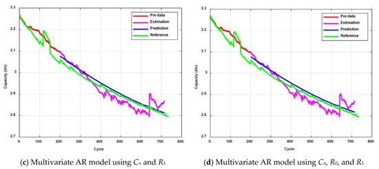The prediction results of the AR model utilizing the estimated capacity from the DEKF are shown in Figure 12. The red and purple lines represent the estimated capacity. The average MAPE was under 1%. The prediction result in Figure 12a is similar to that in Figure 12a obtained using the estimated capacity only. The MAPE of the prediction results was 1.4518%, and the performance of prediction model was higher than that achieved using the measured capacity because the overall trend between 50 and 200 cycles tended to decrease, but the estimated capacity increased and decreased repeatedly. When R0 and R1 were applied to the AR model, the prediction results were superior to those obtained using the capacity only, as shown in Table 3.