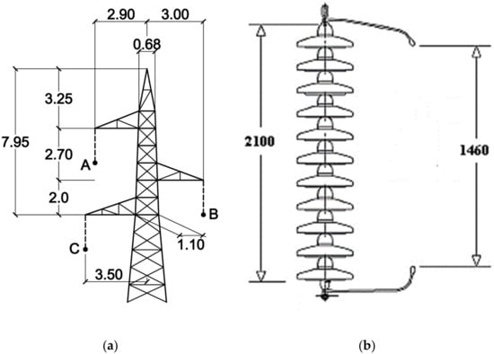 (a) 150 kV overhead transmission line (OHL) tower outline (dimensions are expressed in meters). (b) Line insulation (dimensions are expressed in millimetres).