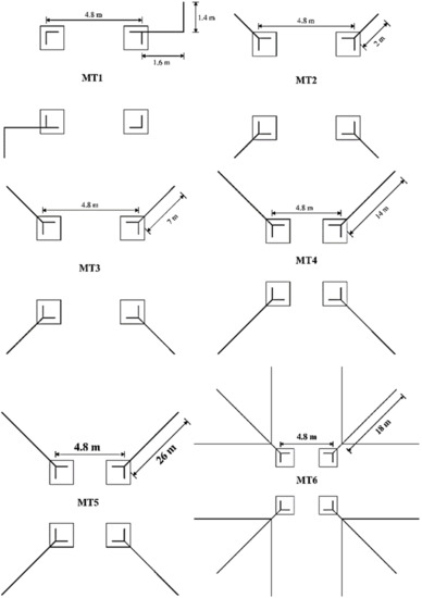 The type of tower grounding systems installed in Italian subtransmission lines is dictated by Terna unified design document LF 91 [32]: six different grounding system arrangements are available, as shown in Figure 2. Each arrangement is made of strap iron (FE 360 B, 15.887 mm radius, ρ = 0.1 × 10−6 Ω·m) buried at ~0.8 m depth; branch terminals (not shown in Figure 2) are 1.4 m long with a 45° slope (only MT1 arrangement has no branch terminal). Terna unified design prescribes the installation of each arrangement in a specific range of soil resistivity values, as shown in Table 2. Soil is considered uniform and not layered.