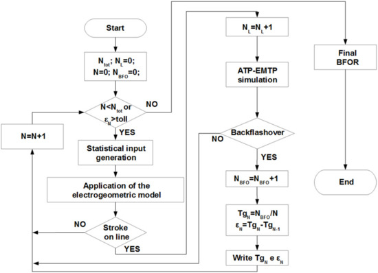 where NBFO is the total number of simulated backflashovers, Nconv is the number of the generated lightning that corresponds to the convergence of the procedure and Ng is the ground flash density (flashes/km2/year). The numerical coefficient 0.6 is used, as suggested in [34], to take into account also lightning strokes within the span, which are assumed not causing backflashover. A flowchart describing the Monte Carlo procedure is reported in Figure 3. In the following subsections, a short description of the statistical input of the procedure, as well as of the ATP-EMTP sub-models of the complete system, is given.