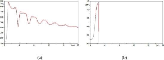A 10 km long, 150 kV OHL is considered. Line spans are 400 m long, each simulated in ATP-EMTP by means of the J-Marty model centred at 100 kHz. At both ends, the line is connected to the surge impedance matrix and terminated on a three-phase 150 kV—50 Hz voltage system, whereas the shield wire is solidly grounded. Segments and cross-arms of the towers are modelled as lossless single-phase transmission lines with the Bergeron model, considering a Zs as evaluated with (1) and propagation speed equal to 2.99 × 108 × m × s−1.