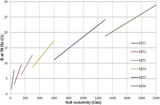 Lastly, Table 16 summarises 150 kV OHL BFOR results, normalised for Ng = 1 ground flash density value; for each grounding arrangement both the minimum and the maximum allowable soil resistivity values have been considered, with the exception of MT1 (in this case, only the maximum soil resistivity value has been considered). Results show a tenfold increase of BFOR over the 50–2000 Ω·m soil resistivity range.