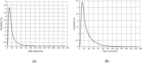 (a) Probability distribution of the peak currents of the generated Ntot flashes; (b) Probability distribution of lightning peak currents impinging the OHL, in percent of the generated flashes.