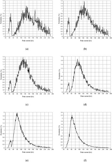 Probability distribution of the peak currents of NBFO flashes causing backflashover. (a) MT1 grounding arrangement, ρg= 50 Ω m; (b) MT2 grounding arrangement, ρg= 150 Ω m; (c) MT3 grounding arrangement, ρg= 300 Ω m; (d) MT4 grounding arrangement, ρg= 600 Ω m; (e) MT5 grounding arrangement, ρg= 1300 Ω m; (f) MT6 grounding arrangement, ρg= 2000 Ω m.